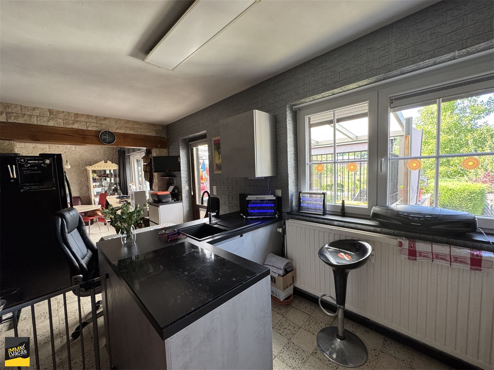 Maison : cuis équip, living 30 m2, bureau/chambre au rez, pergola de 45 m2, SDB, 2 CH, caves, buanderie, garage, atelier, emplacement parking