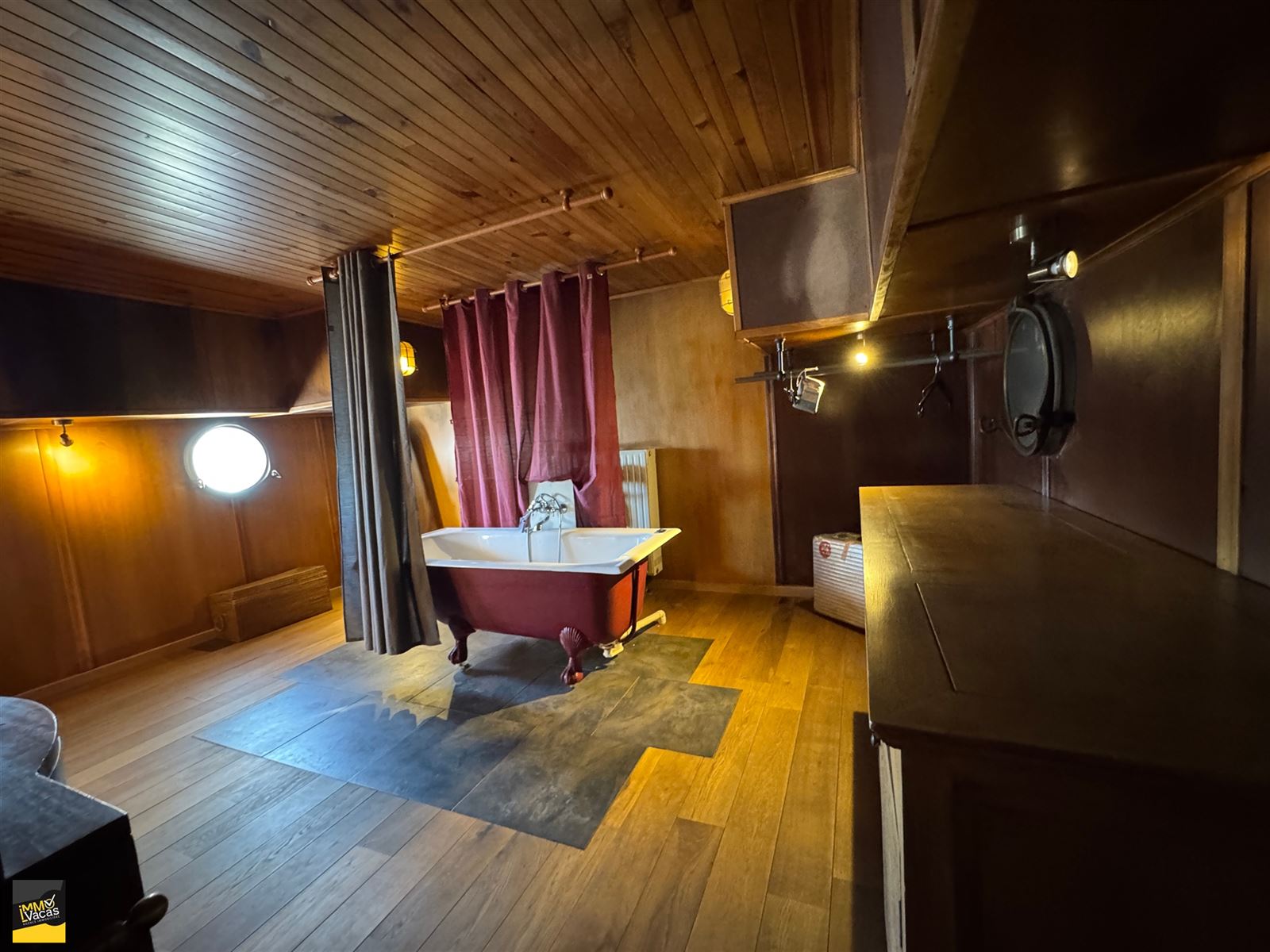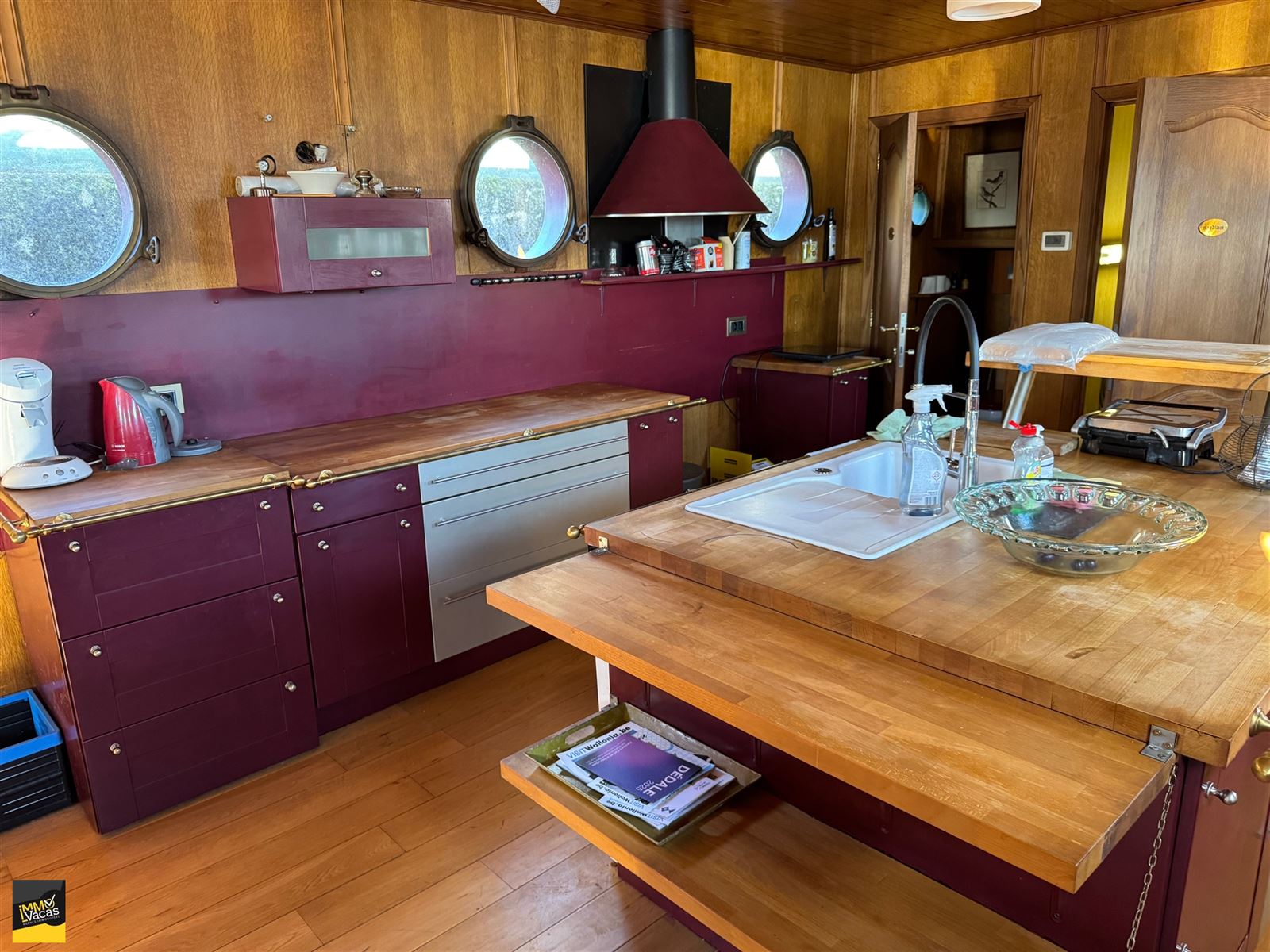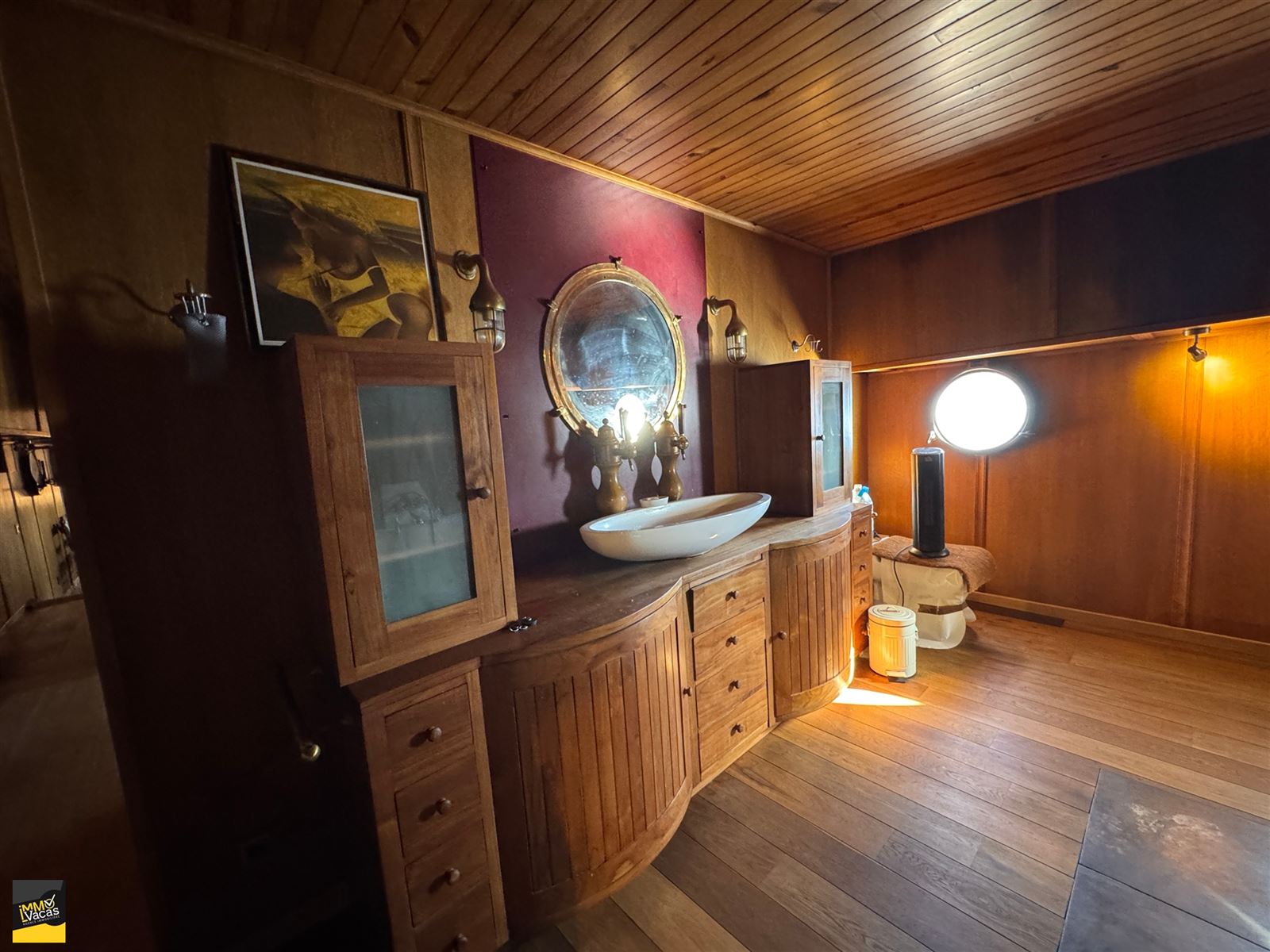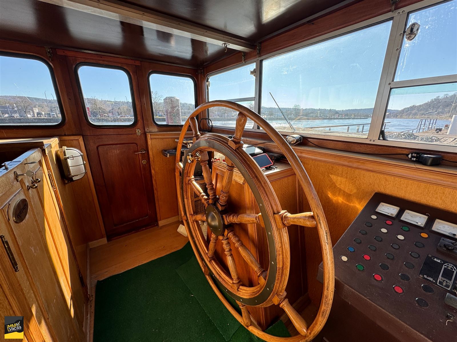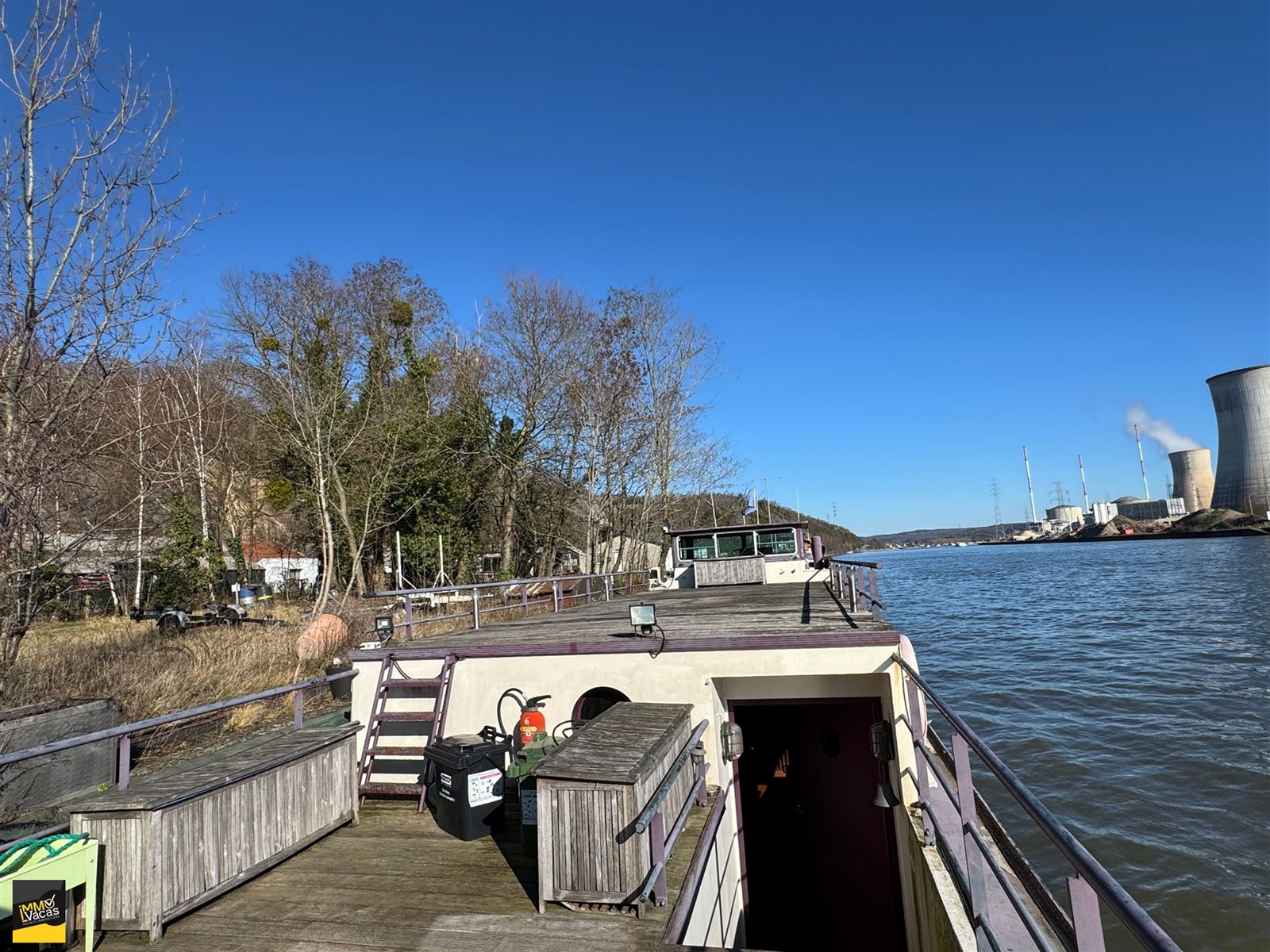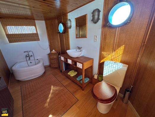 SBD équipée bain, wc, double lavabo avec robinet pompes à bières.Grandes terrasses. Isolée (mousse projetée), lestée tirant d'eau 1,60m, 4 cuves d'eau de 1000 litres, 1 cuve d'eau grise. CC mazout 2006, électricité conforme, domicile possible.