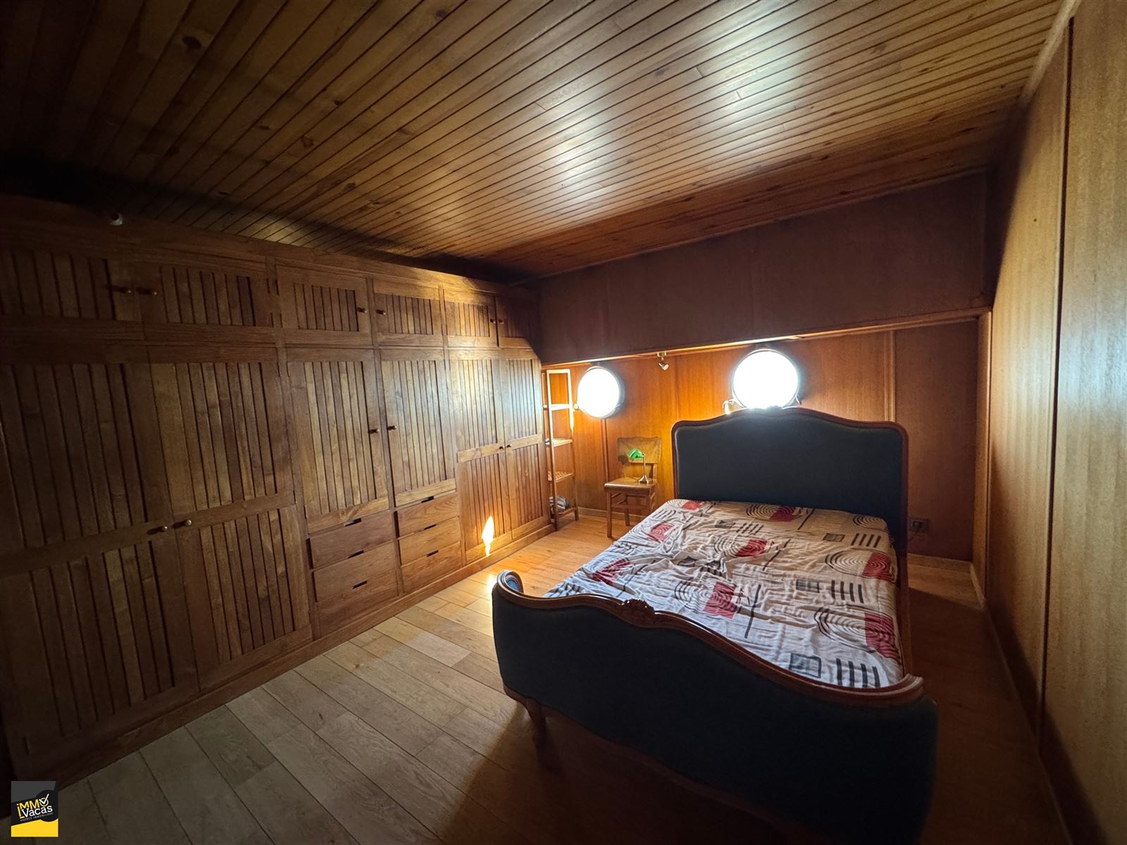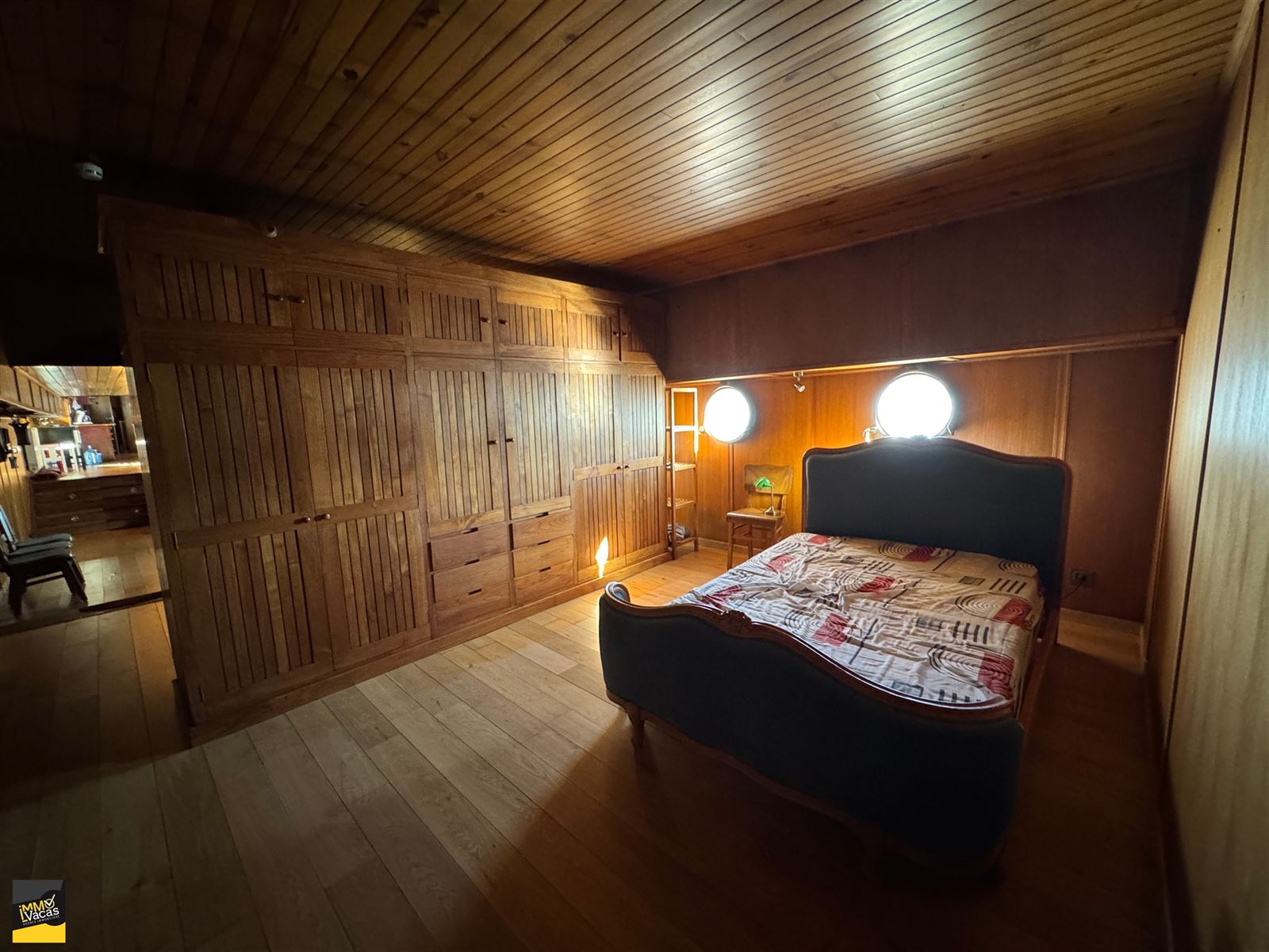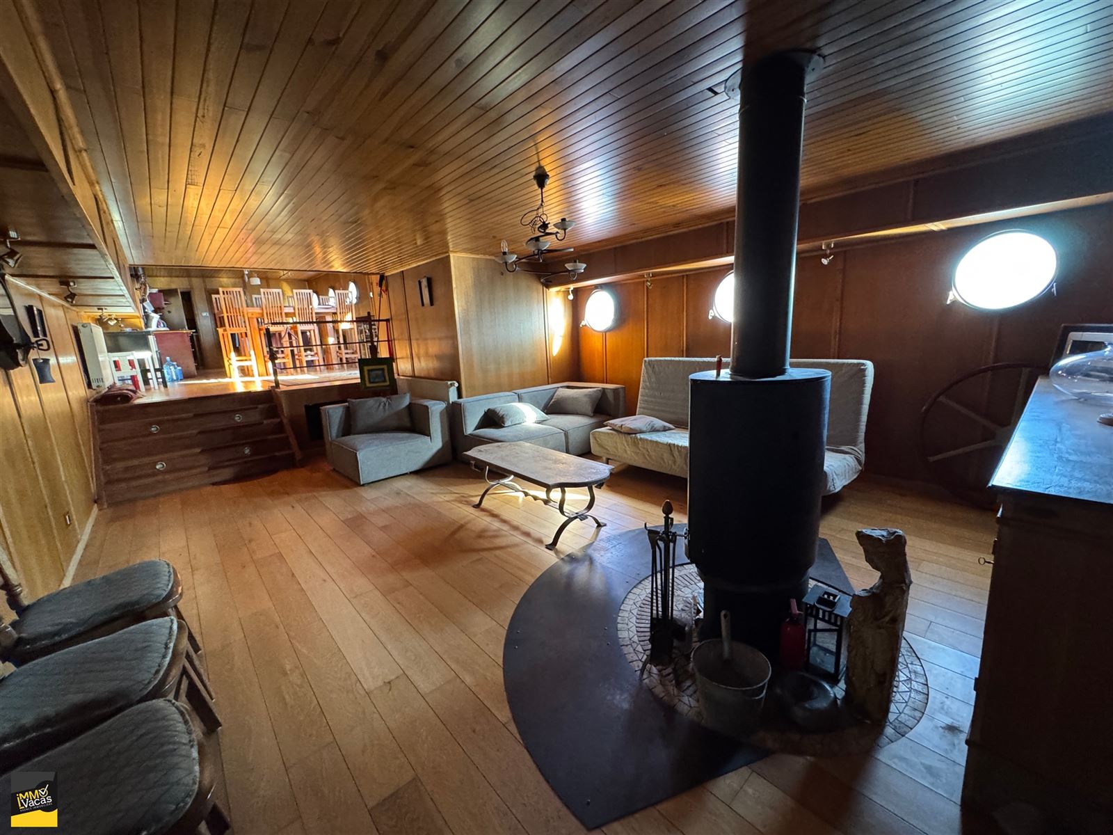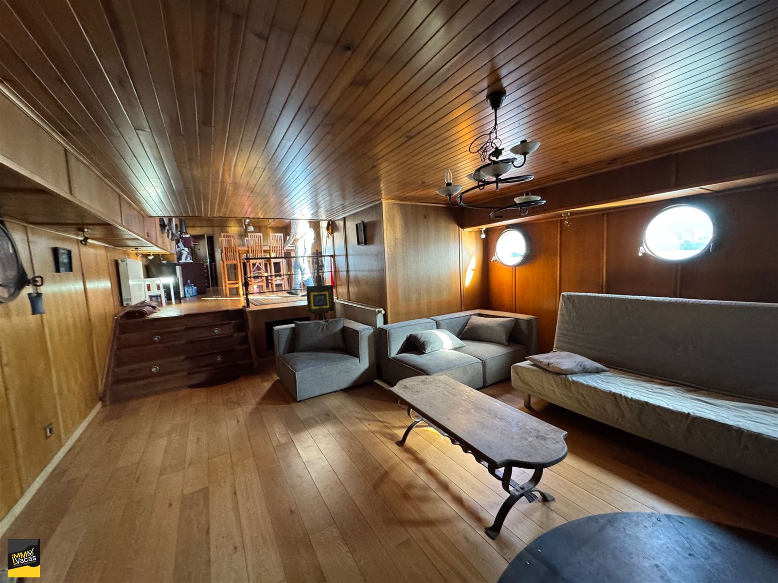 Cabine du capitaine avec lit, baignoire, WC et lavabo, cuisine équipée avec îlot central (sauf fourneaux), sàm en teck et 8 chaises, salon avec feu à bois tournant en fonte, 2 ch en enfilade, dressing en teck,